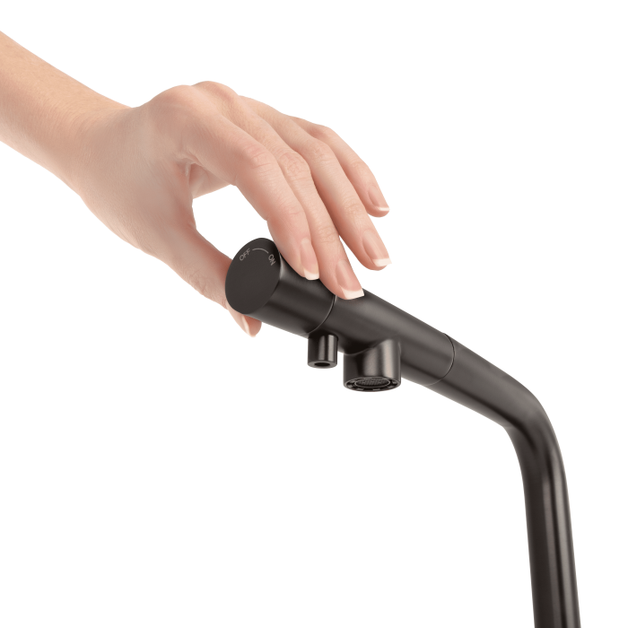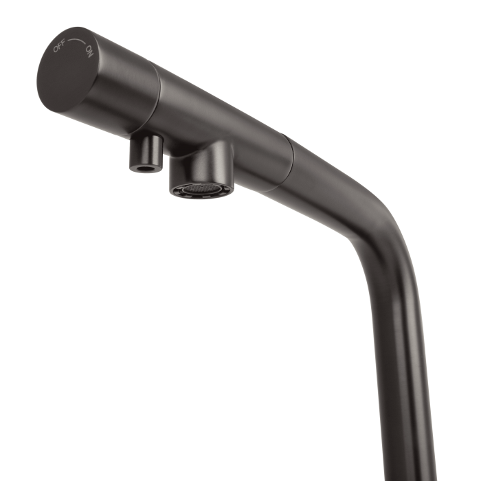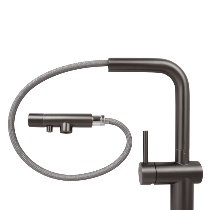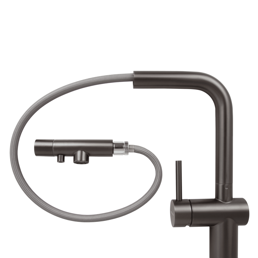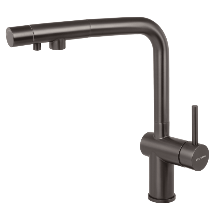 С вороненой стали смеситель для кухни с фильтром оснащен дополнительным носиком для подачи очищенной воды, что исключает смешивание фильтрованной воды с водопроводной. Стильный дизайн с порошковым покрытием идеально подходит для современных кухонь в Киеве, Днепре, Одессе, Виннице и Хмельницком.